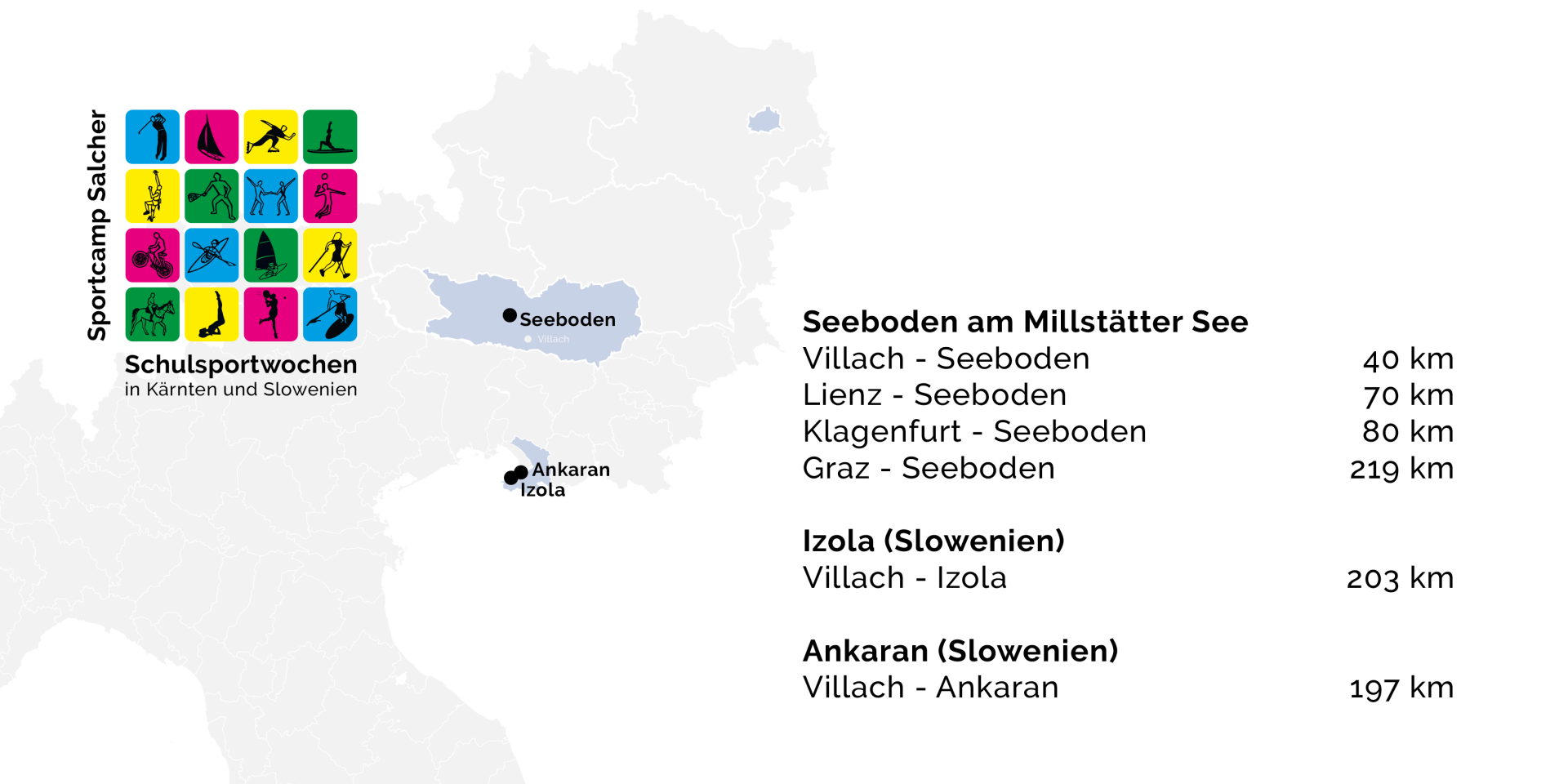 Das Sportcamp Salcher organisiert Schulsportwochen in Kärnten und Slowenien. Mit mehr als 30 jähriger Erfahrung, lokalen Partnern und geprüften TrainerInnen bieten wir Ihnen professionelle und erlebnisreiche Sportwochen. Durch frei wählbare Sportarten und viele verschiedene Partner - Quartiere planen Sie eine individuelle Sommersportwoche nach Ihren Wünschen mit unserer Hilfe.